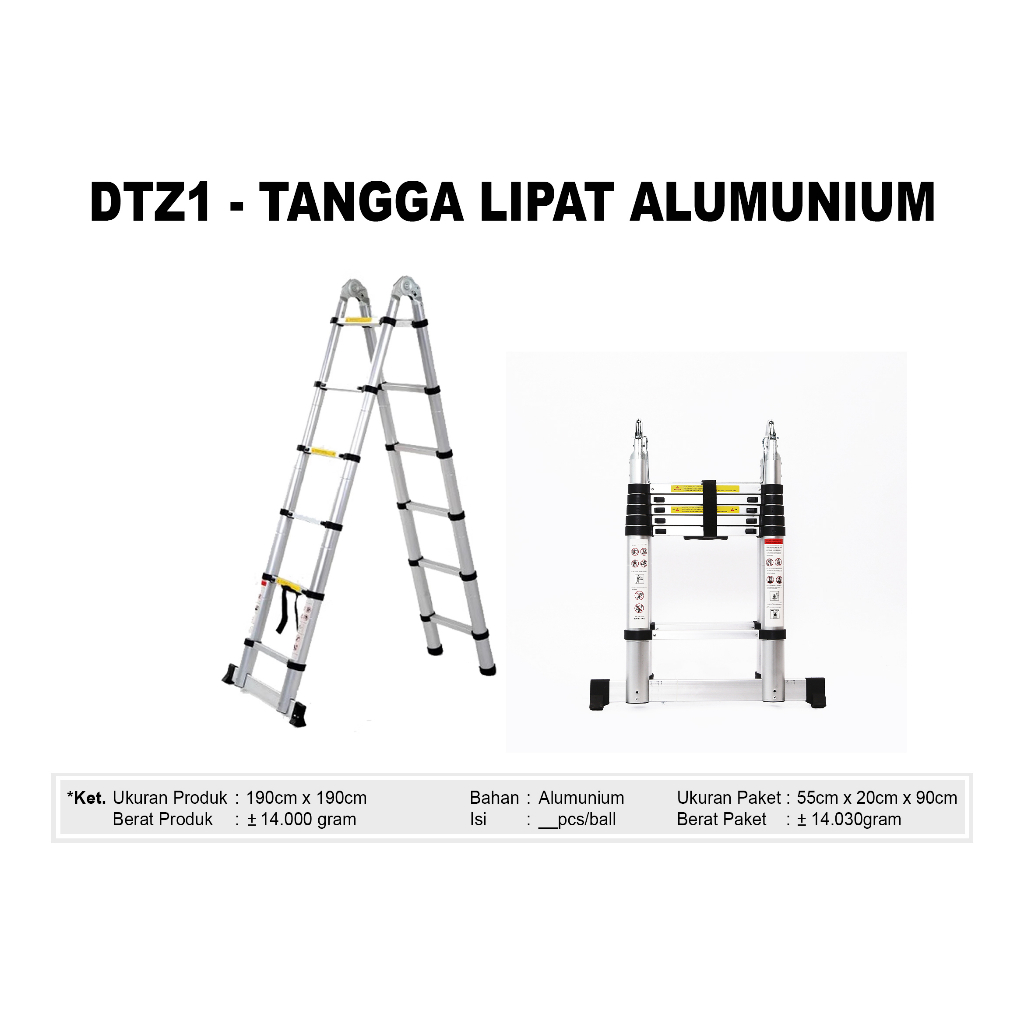 Informasi produk : DTZ-1 ▪️ Nama : Tangga lipat alumunium ▪️ Ukuran : 190cm x 190cm ▪️ Berat : 14 Kg ▪️ Bahan : Aluminuim ▪️ Size Terlipat: 85cm ▪️ Kapasitas: 150kg