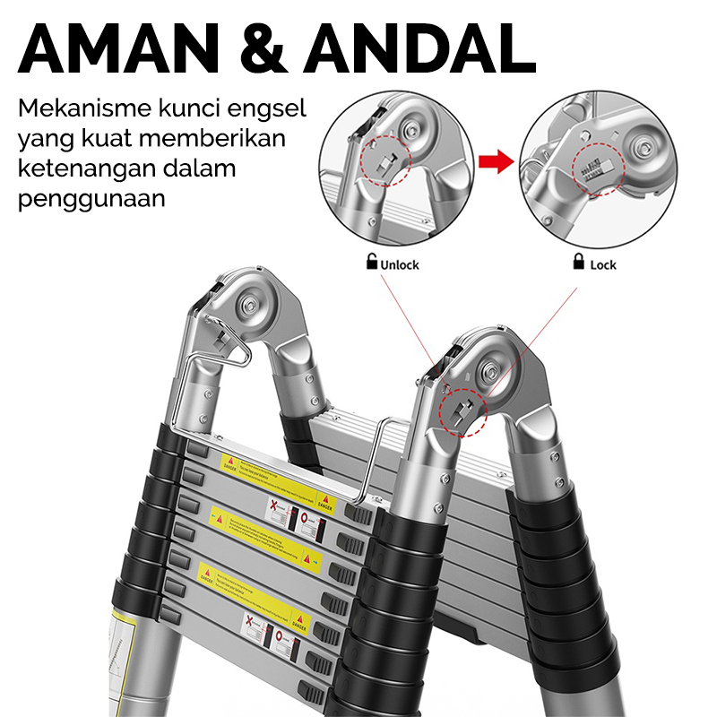 Keunggulan: -Mudah di bawa kemana2 (ringan&compact) -Mudah disimpan, ukuran akan mengecil secara signifikan saat dilipat -Tidak licin, alas karet yg mengoptimalkan gesekan dengan tanah -Kunci Ergonomis, teknologi yg meningkatkan keamanan dan kemudahan -Aman dan flexibel, kunci di setiap anak tangga memberi flexibilitas pengaturan ketinggian.