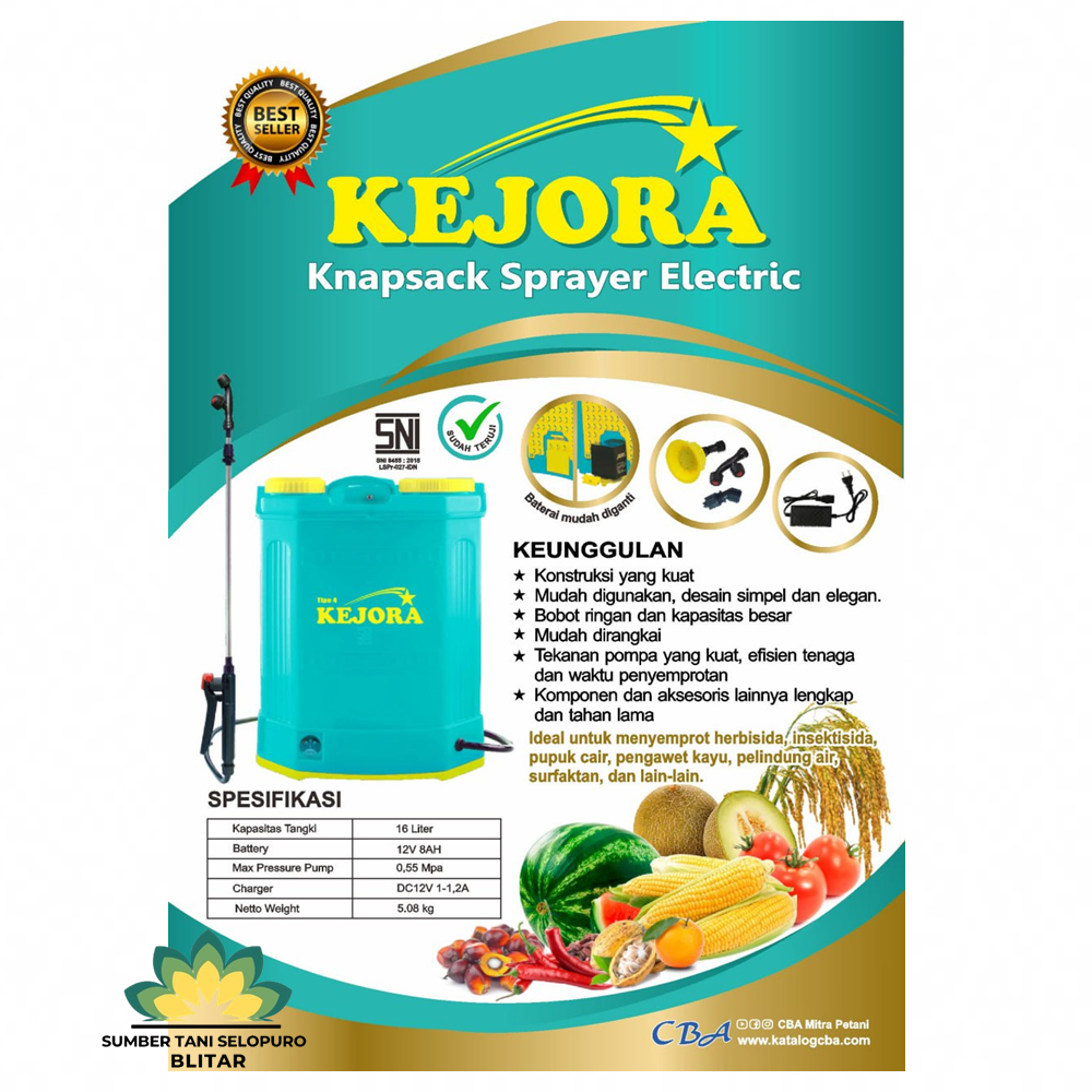 Keunggulan : 1. Tabung dan kontruksi yang kuat 2. Mudah digunakan karena desainnya yang simple namun terlihat elegan 3. Bobot tangki ringan dan kapasitas besar 4. Mudah dirangkai 5. Tekanan pompa kuat, sehingga lebih efisien tenaga dan waktu saat penyemprotan 6. Terdapat komponen dan aksesoris yang lengkap dan tahan lama 7. Batrai mudah dilepas atau pasang 8. Produk terbestseller dan sudah SNI