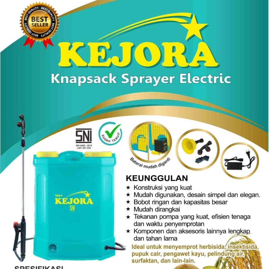 Spesifikasi Kejora Sprayer Elektrik Berat Bersih : 5,08 kg Kapasitas : 16 Liter Material Tangki : Polypropilene Sistem Pompa : Elektrik Otomatis Battery : 12V8AH Charger:DC12V 1-1.2A Max Pressure Pump : 0.55 MPa Warna : Hijau Telur Asin SNI Isi Paket Sprayer Kejora Electric Knapsack Sprayer Charger Baterai 3 Buah Nozzle Spuyer Manual Book Sabuk