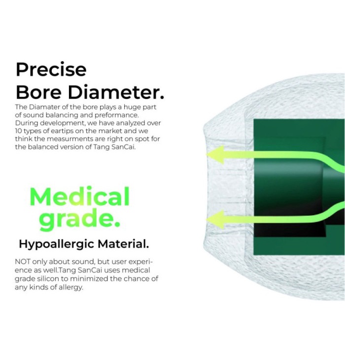 The diameter of the bore plays a huge part in sound balancing and performance. During development, we analyzed over 10 types of ear tips on the market and we think the measurements are right on the spot for the balanced version of Tang SanCai.