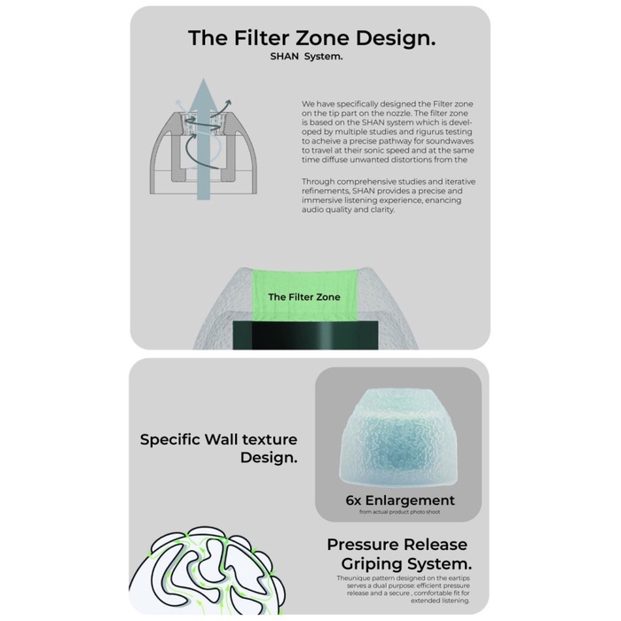 We have specifically designed the filter zone on the tip part of the nozzle. The filter zone is based on the SHAN system which is developed by multiple studies and rigorous testing to achieve a precise pathway for soundwaves to travel at their sonic speed and at the same time diffuse unwanted distortions. Through comprehensive studies and iterative refinements, SHAN provides a precise and immersive listening experience, enhancing audio quality and clarity.