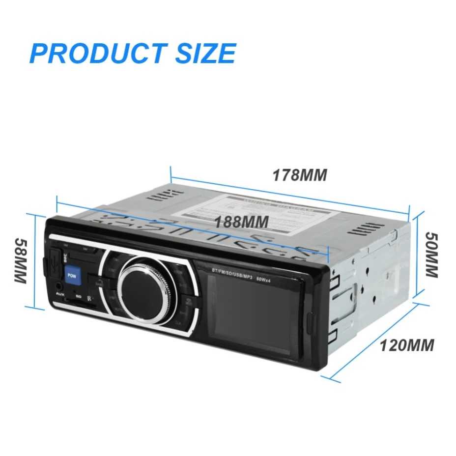 Total Power Output 60 Watt x 4 Tegangan: 12 V Frekuensi Respon 20 Hz - 20 KHz Impedance 4 Ohm Sound to Noise Ratio 80 Db Material Plastik dan Metal Dimensi 186 x 85 x 58 mm Lain-lain Radio Rentang Frekuensi: 87.5-108.0 MHz Format File Audio: MP3, WMA dan WAV Adaptor Audio Nirkabel: Kartu SD, FM, AUX dan U disk Plug: ISO