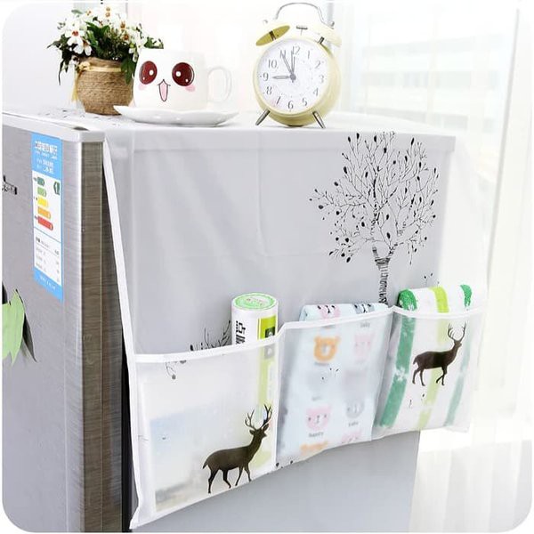 Penutup bagian atas kulkas berfungsi sebagai pelindung dari debu / kotoran, agar kulkas bagian atas tidak kotor maupun baret. Juga dapat berfungsi sebagai dekorasi yang dilengkapi dengan variasi kantong (3 kantong masing-masing 2 sisi) untuk menaruh barang2 keperluan dapur. Mudah dicuci jika terkena noda.
