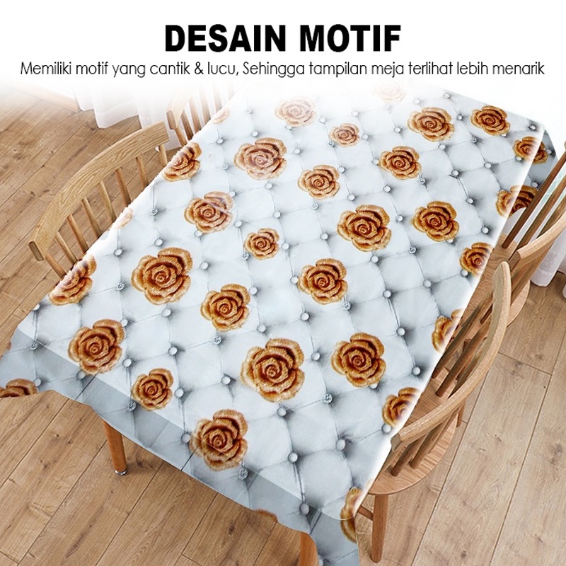 Taplak meja cantik dari bahan plastik anti air. Hadir dengan aneka motif menarik, tampilan meja jadi cantik dan modern.