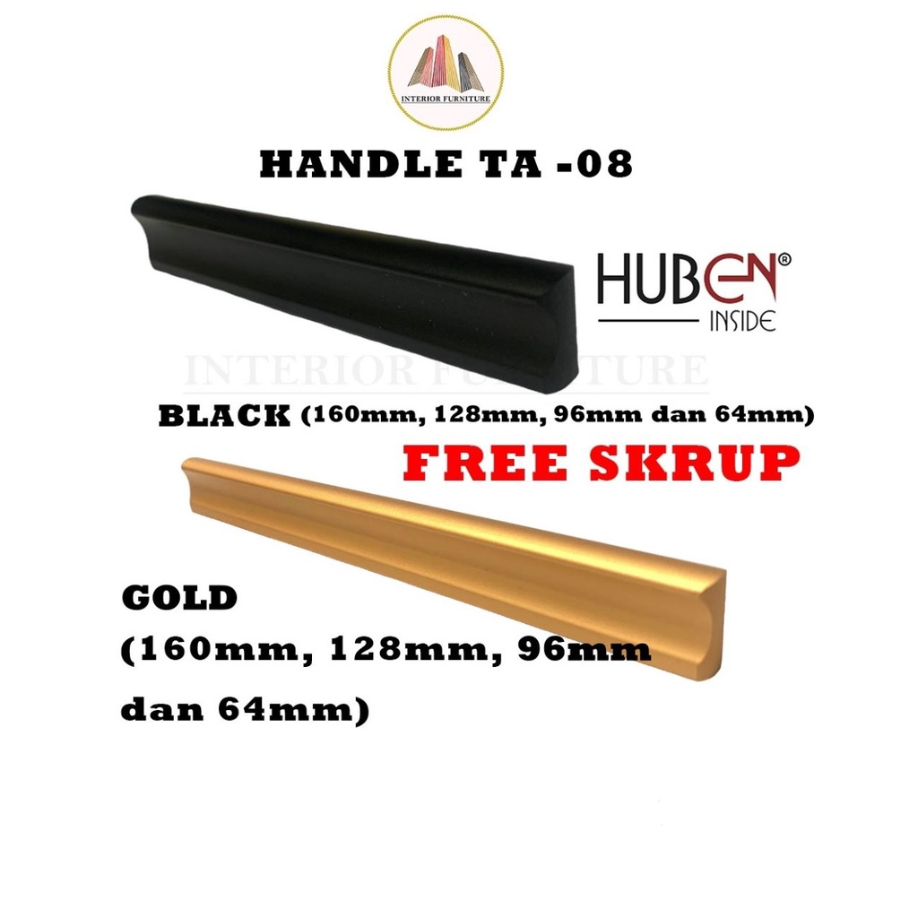 Tarikan Pegangan Laci Type : TA-08 Merk : Huben Bahan : Aluminium Finish : Black & Gold Ukuran : - 64mm - 96mm - 128mm - 160mm FREE SKRUP