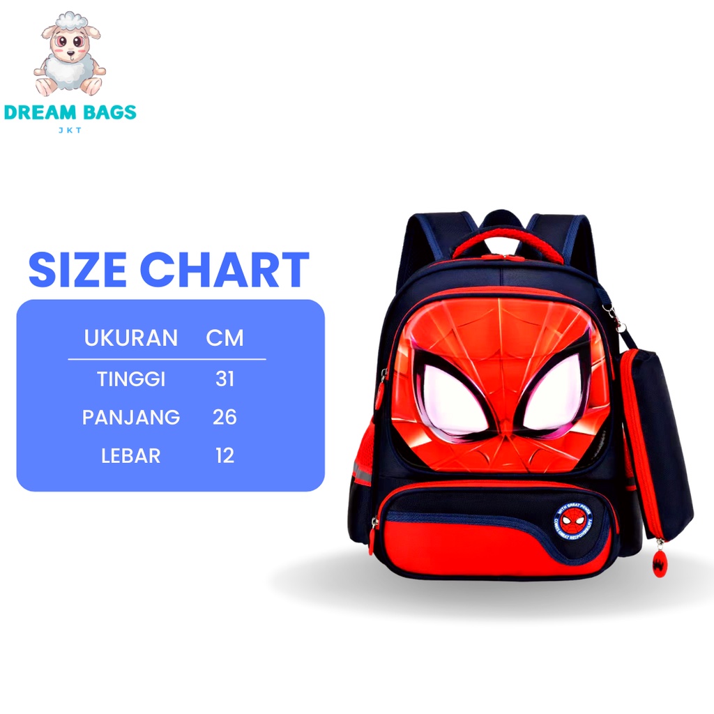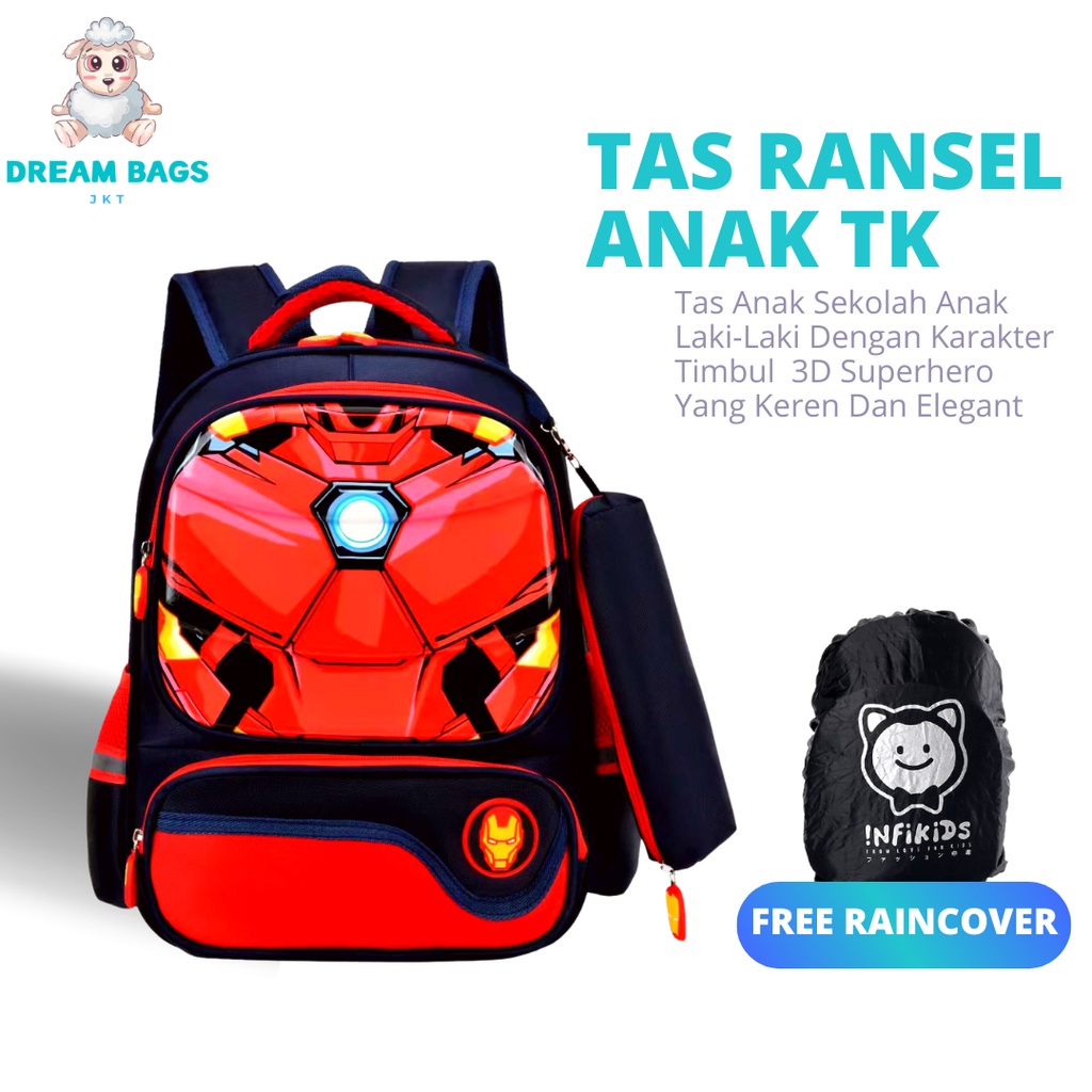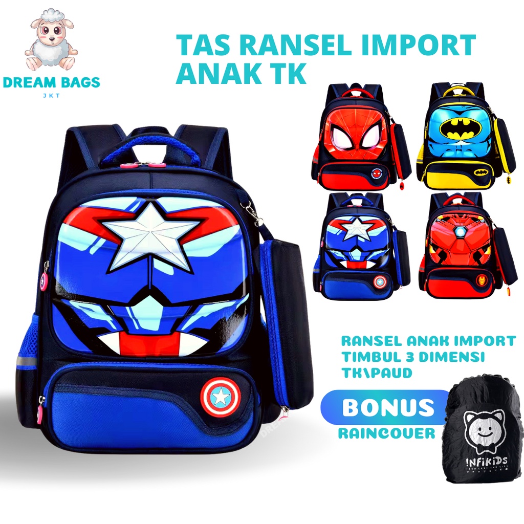 Spesifikasi : - Gratis Raincover + Kotak Pensil - Size : - + 31cm x 12cm x26 cm untuk PAUD Kelas TK - Material : Nylon,Polyester Embos - Karakter : Capten,Spidermen,Betmen,Ironmen