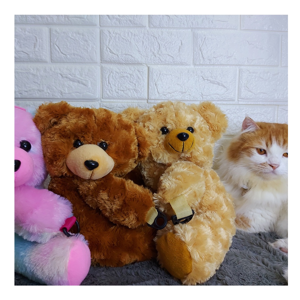 - Nama Produk : Tas Boneka Beruang Rangkul - Bahan : * Cover : Terbuat dari bahan Rasfur yang halus, lembut, tidak mudah rontok. * Isian : Dacron Silicon jadi empuk dan nyaman. - Ukuran : Panjang (+-) 29cm