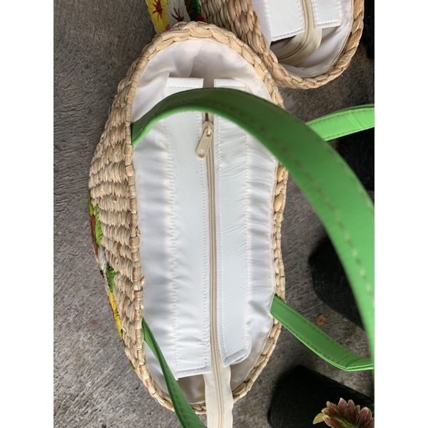 bahan Enceng gondok tali vinil/kulit sintetis sulam bunga dari pelepah pisang ukuran panjang bawah 25cm panjang atas 38cm tinggi 24cm lebar 14cm inner furing resleting