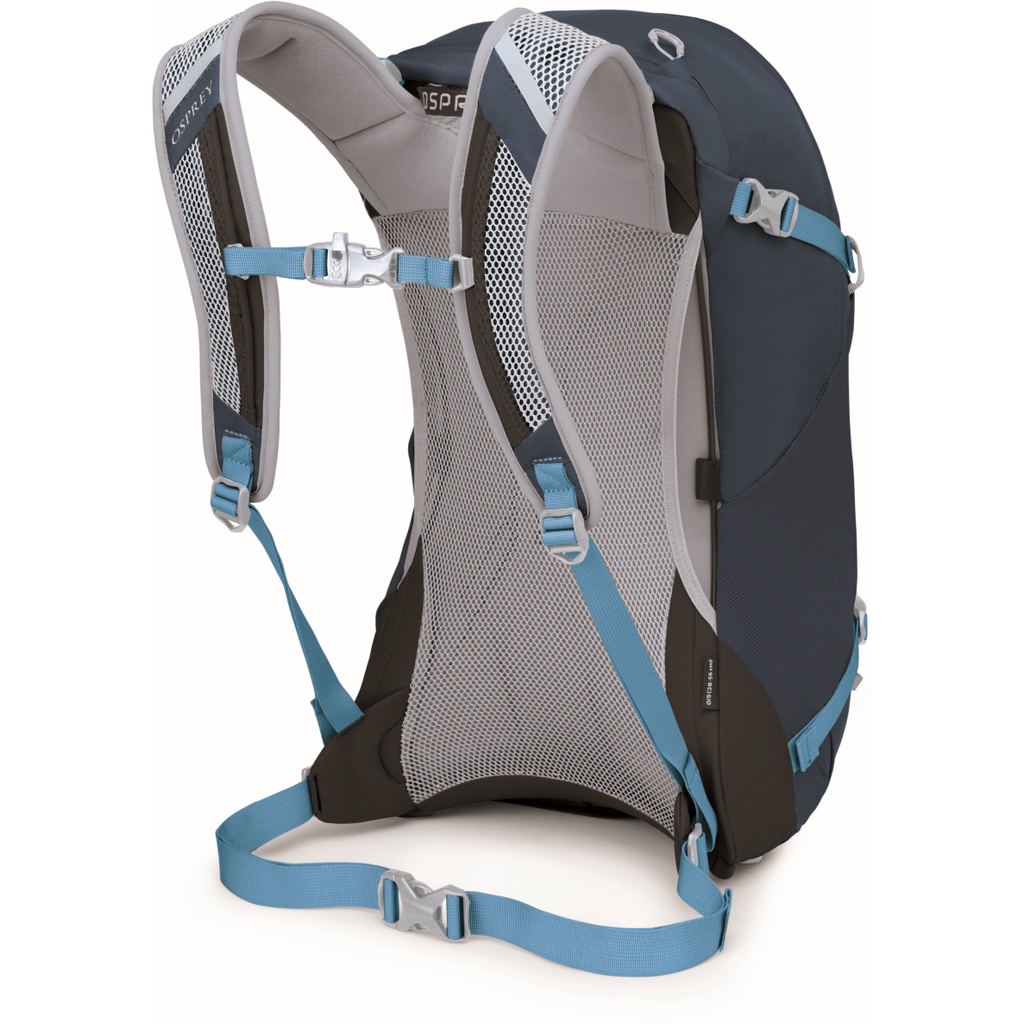 Features : - Includes rain cover made from bluesign®-approved materials with PFAS-free DWR impregnation that stows in a zippered compartment on the bottom - Two compression straps at top side for attaching trekking poles - Extra-large elastic mesh side pockets for secure stowage - Internal hydration bladder compartment with tube opening on back panel and Osprey Hydraclip for easy hydration bladder hanging - Adjustable sternum strap with signal whistle - Removable hip belt
