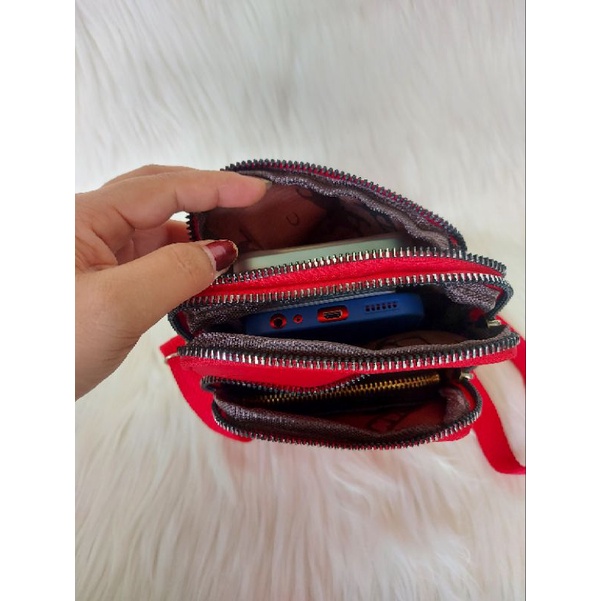 Tas hp Lv 1090 Res 2 Material leather waterproof Sz 19x4,5x11 Dalam 4 ruang 6 slot kartu Tali panjang bisa di adjust Zipper emboss Motif mono dan damier Berat 250 gram