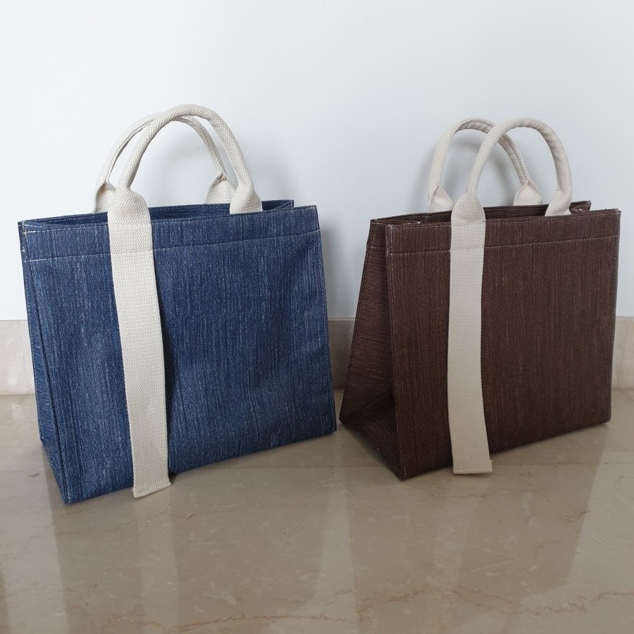 Bahan: Denim sintetic. lapisan dalam bersifat waterproof. tidak langsung basah bila bagian luar tas terkena cipratan air.
