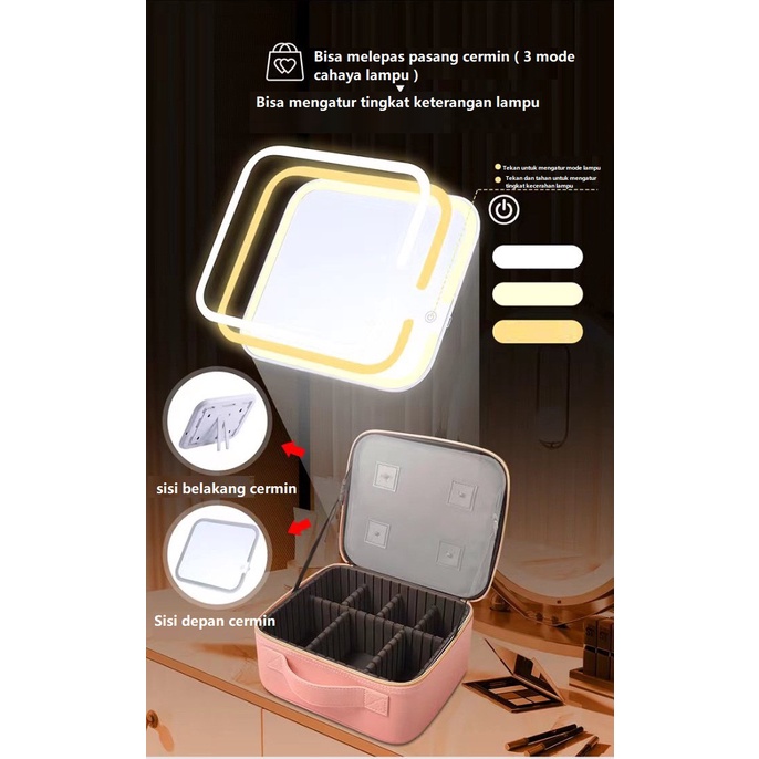 Kelebihan produk : 1. Kualitas Import 2. Warna Baru soft pink 3. Bahan PU luar yang anti air 4. Cermin LED yang bisa dicharge ulang ( USB type C ) dan bisa dipakai terpisah ( bisa berdiri ) 5. 3 mode warna lampu dan bisa setting ( redup, sedang atau terang ) 6. Ukuran Praktis Mudah dibawa berpergian ( bagian dalam cover depan terdapat slot yg bsa dipasang dengan cermin ataupun dengan selop alat kuas