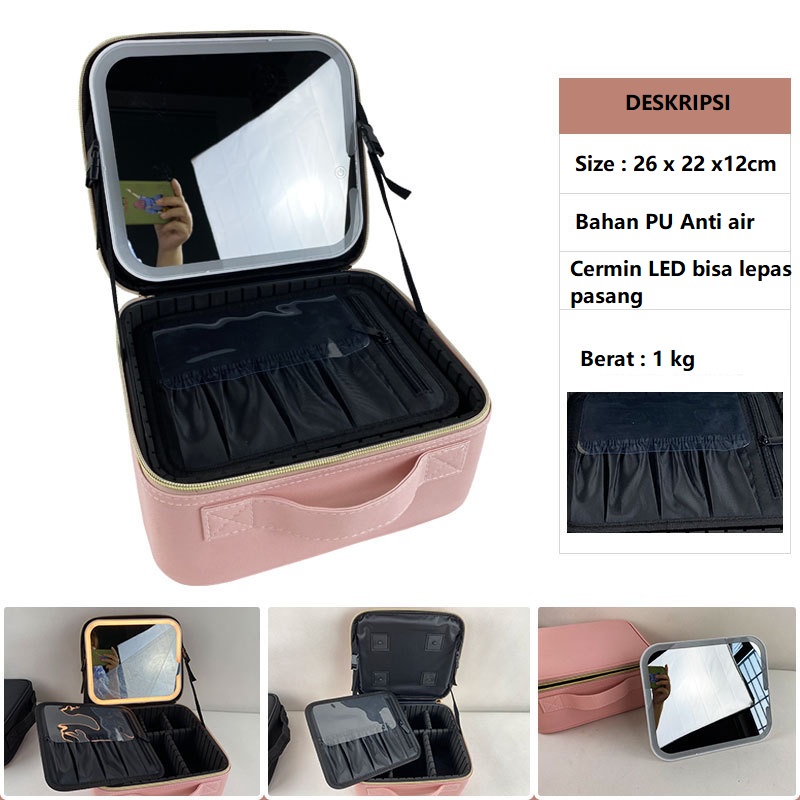 Tas kosmetik desain baru dengan kualitas premium dengan ukuran yang imut ini bisa anda bawa berpergian kemanapun dilengkapi cermin LED yang bisa membantu kk untuk merias bahkan di kondisi lingkungan yang gelap.