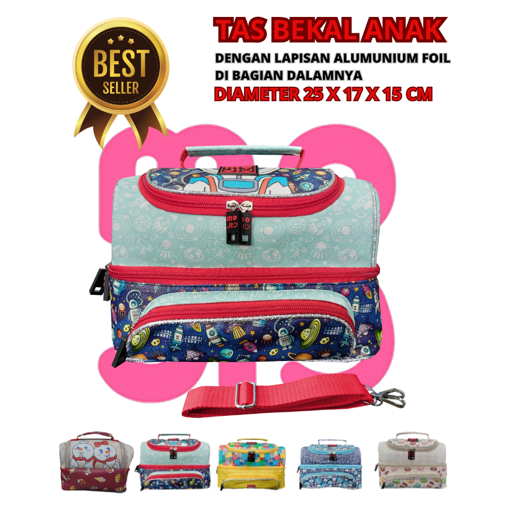 Tas multifungsi yang mempermudah anda dalam membawa bekal makanan bagi anak maupun orang dewasa. Desainnya yang trendi, ukuran yang pas, dan bisa diselempang dengan tali yang disediakan, membuat tas ini sangat cocok dipakai untuk membawa bekal untuk Sekolah, Kuliah, Kerja dll. dengan Diameter Panjang 25 cm, Lebar 15 cm, dan Tinggi 17 cm Tas ini memiliki beberapa ruang yang fungsional. 1 ruang pada bagian bawah tas yang berguna untuk meletakan kotak bekal dengan lapisan alumunium foil didalamnya membuat suhu makanan tetap terjaga sehingga tidak mudah basi, 1 ruang lagi pada bagian atas tas yang cukup luas berguna untuk meletakan barang lainnya pelengkap bekal makanan. 1 ruang lainnya pada bagian depan tas untuk alat makan yang sudah didesain sehingga ukurannya pas dengan alat makan seperti sendok, garpu dll. Dibuat dengan menggunakan bahan berkualitas yang tahan air dengan varian motif yang beragam. Tersedia juga tali yang bisa dilepas pasang dengan cantolan berbahan alumuium kuat yang tidak berkarat sehingga tas ini bisa di selempang.