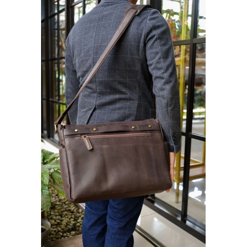 Material : kulit sapi pull up Warna : darkbrown Lining : kain katun drill Size : 36x11x27 cm