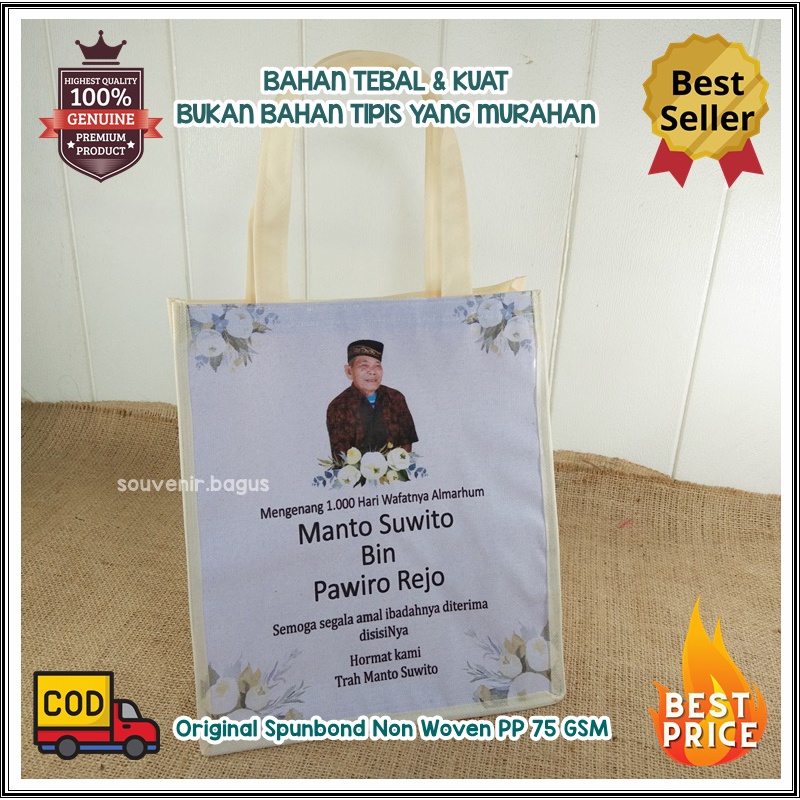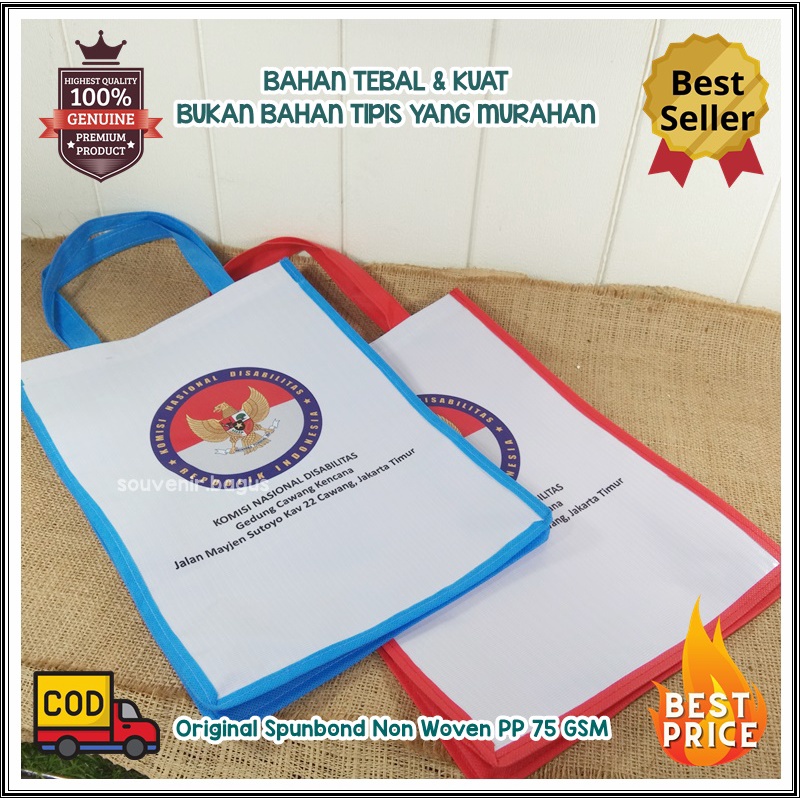 menggunakan ORIGINAL bahan spunbond non woven 75 gsm, kuat hingga beban 7 kg untuk gambar menggunakan bahan vinyl