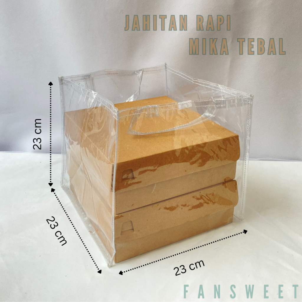 • bahan mika permium dengan ketebalan 0,20 mm • ukuran P23 cm x L23 cm x T23 cm • jahitan kuat dan rapi • muat untuk maksimal box ukuran 22cm • harga tertera untuk harga per pcs tas (1 biji)