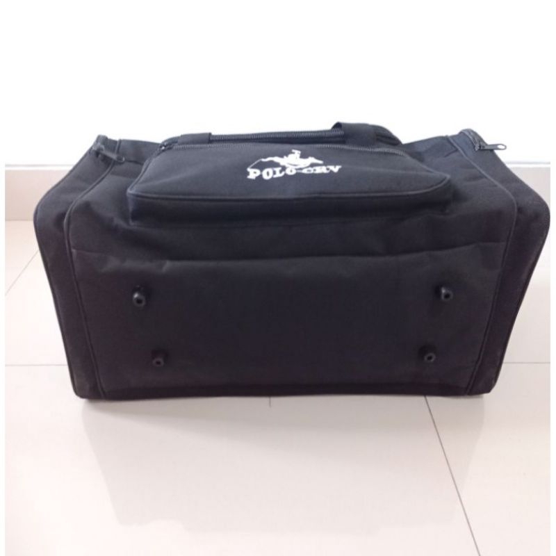 Tas Pakaian polo crv harga ekonomis jahitan sangat kuat Bahan polyester warna hitam ukuran 28-23-50 1 ruangan utama 2 ruangan tambahan kanan& kiri 2 ruangan tambahan bagian depan penutup leseting Tas bisa dijinjing/ dislempang