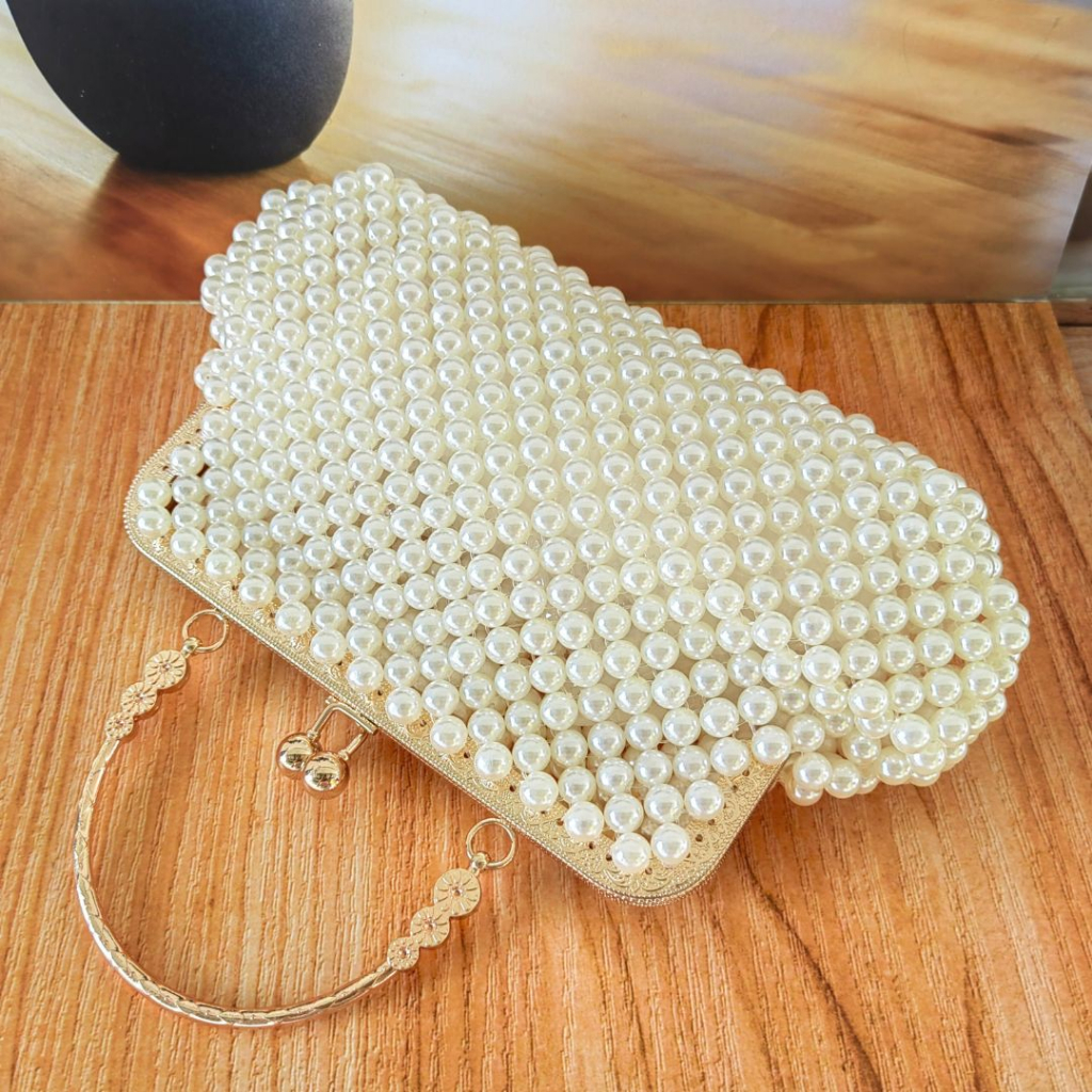 Bahan: - Bahan dasar lentur dijahit langsung dari mutiara. - Mutiara dijahit bukan di lem sehingga lebih tahan. - Muat hape yang ukuran 6.7 inch - Body tas pesta langsung di build-up dari mutiara sehingga menambah kemewahan dan keunikan tersendiri. - Sebagai tambahan, tas pesta ini dilapisi mutiara di kedua sisi. (Full Mutiara).