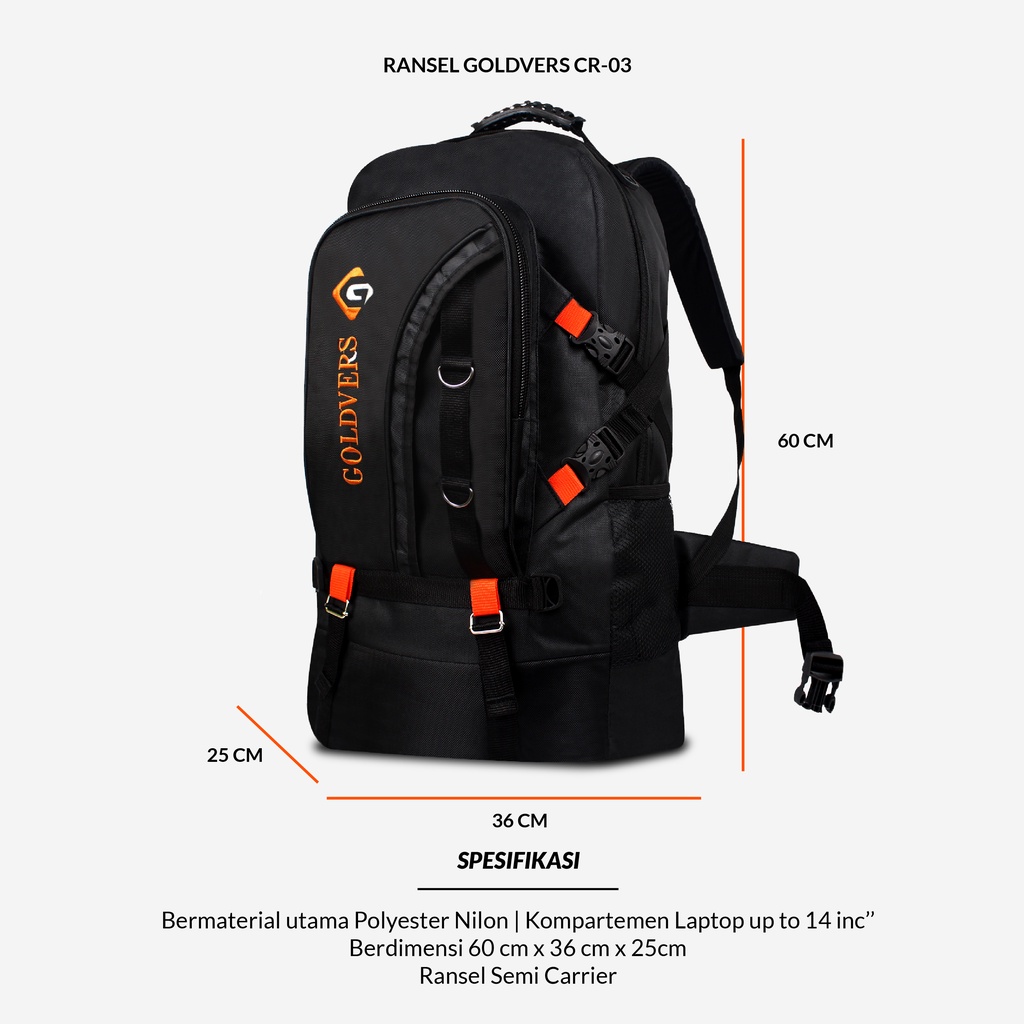 Material utama : Polyester Nilon Dimensi : T: 50 x P: 36 x L: 25 Cm (50 Liter) __________________________________________________________________ FITUR CR02 : • Terdapat 2 ruang resleting, resleting utama yang cukup besar, untuk membawa baju, buku, laptop, dll. • Tali tas ransel ini dapat di setting sesuai postur. • Pada bagian kanan dan kiri. Bodi tas terdapat jaring sebagai tempat botol minum. • Dalam tas menggunakan serat nilon tebal, kekuatan & kelenturannya sangat terjamin. __________________________________________________________________