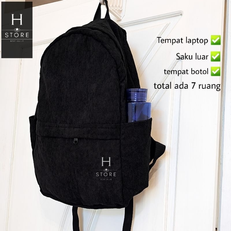 Bahan corduroy salur besar Ukura 43 x 30 x 15 - resleting YKK - Ada tempat laptop muat sampai 15 inch - ada tempat botol air - ada 2 saku tambahan di dalamnya - total ada 7 ruang