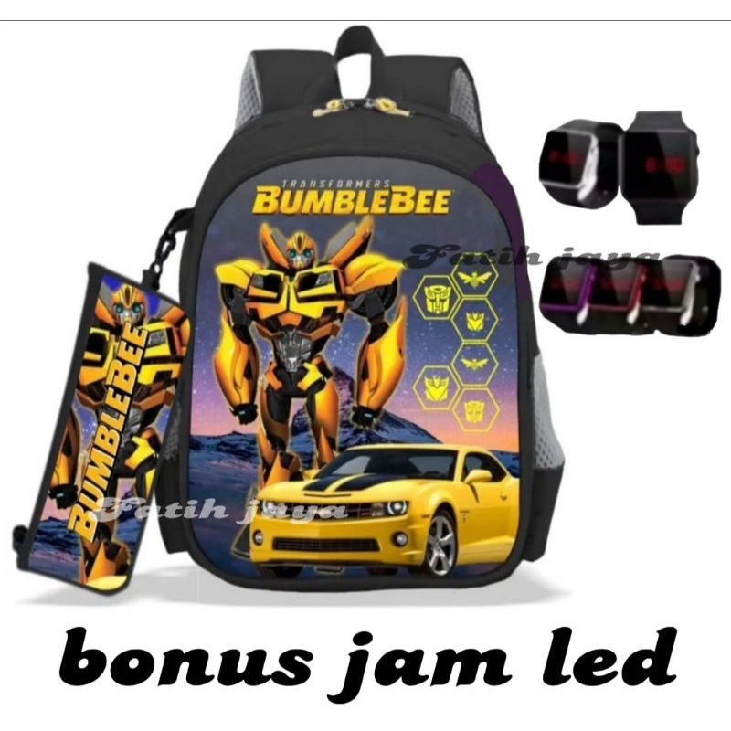 -model tas anak karakter bumblebee -bonus jam led -ada tempat pensil nya -bahan oke -ukuran 38x12x28 -gambar oke -desain mantap -anak pasti senang -yang pasti bikin percaya diri