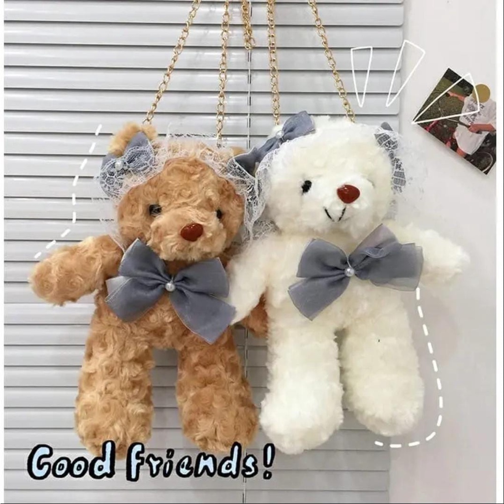 Detail Tas Selempang Bear Boneka Beruang Bulu Slingbag Wanita Teddy Bear Korea Lucu tali rantai