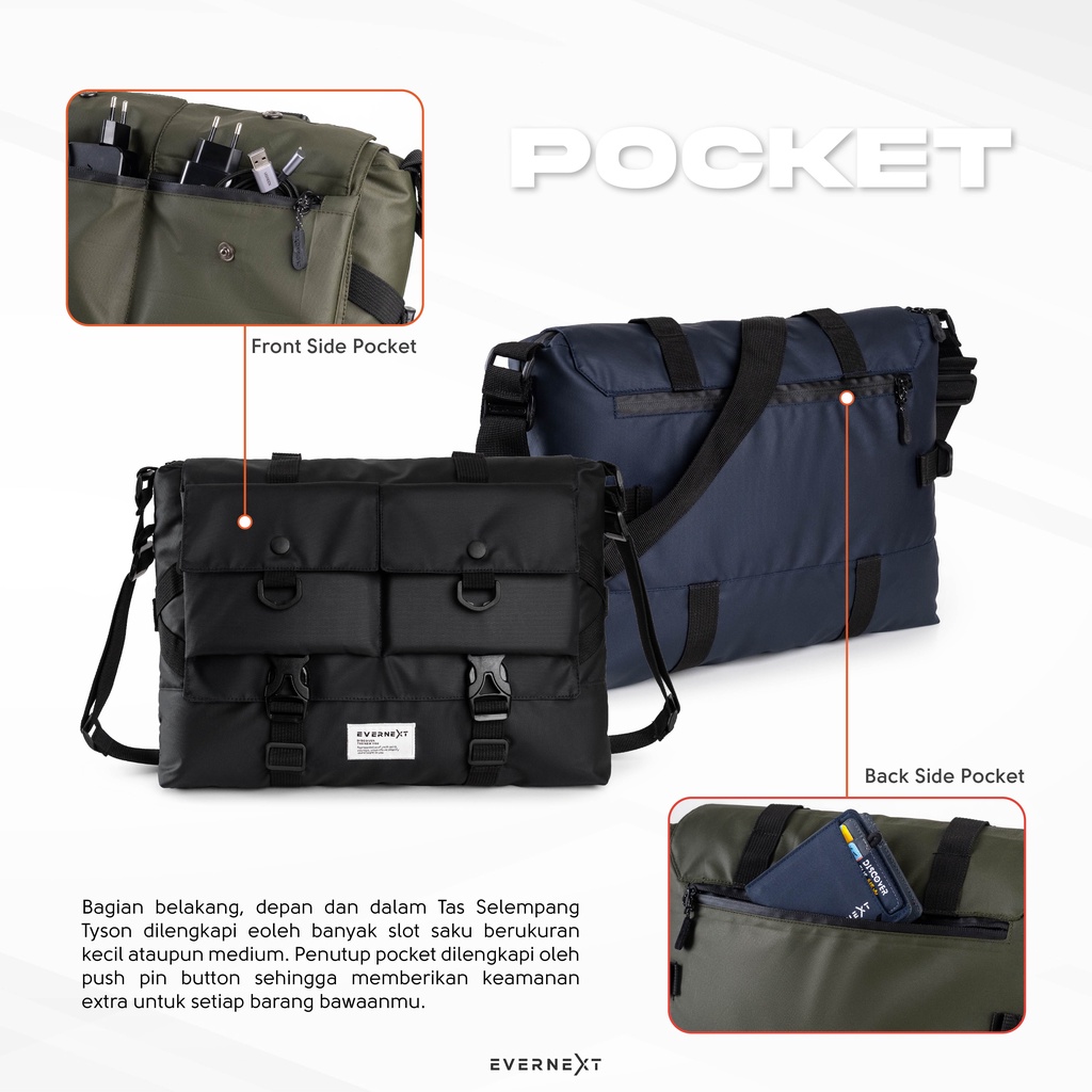 โ Dengan kapasitasnya yang cukup besar dan luas, tas selempang tyson ini cocok digunakan untuk membawa Laptop, dokumen, atau alat kantormu yang lain. Tersedia banyak slot saku yang bisa digunakan untuk menaruh dompet, HP atau power bankmu.