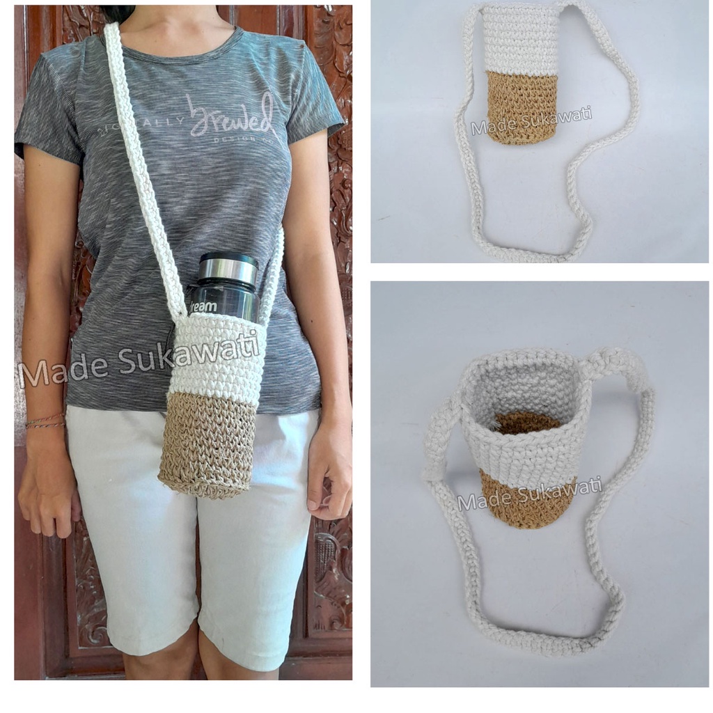 tas slempang rajut bali. bahan rajut benang kombinasi tali ranting, ukuran tas tinggi -+18cm,diameter dalam -+9cm,panjang tali selempang -+96cm, Bagus sebagai wadah botol,dipakai sehari hari.dan juga sebagai souvenir hadiah oleh-oleh unik khas bali,.