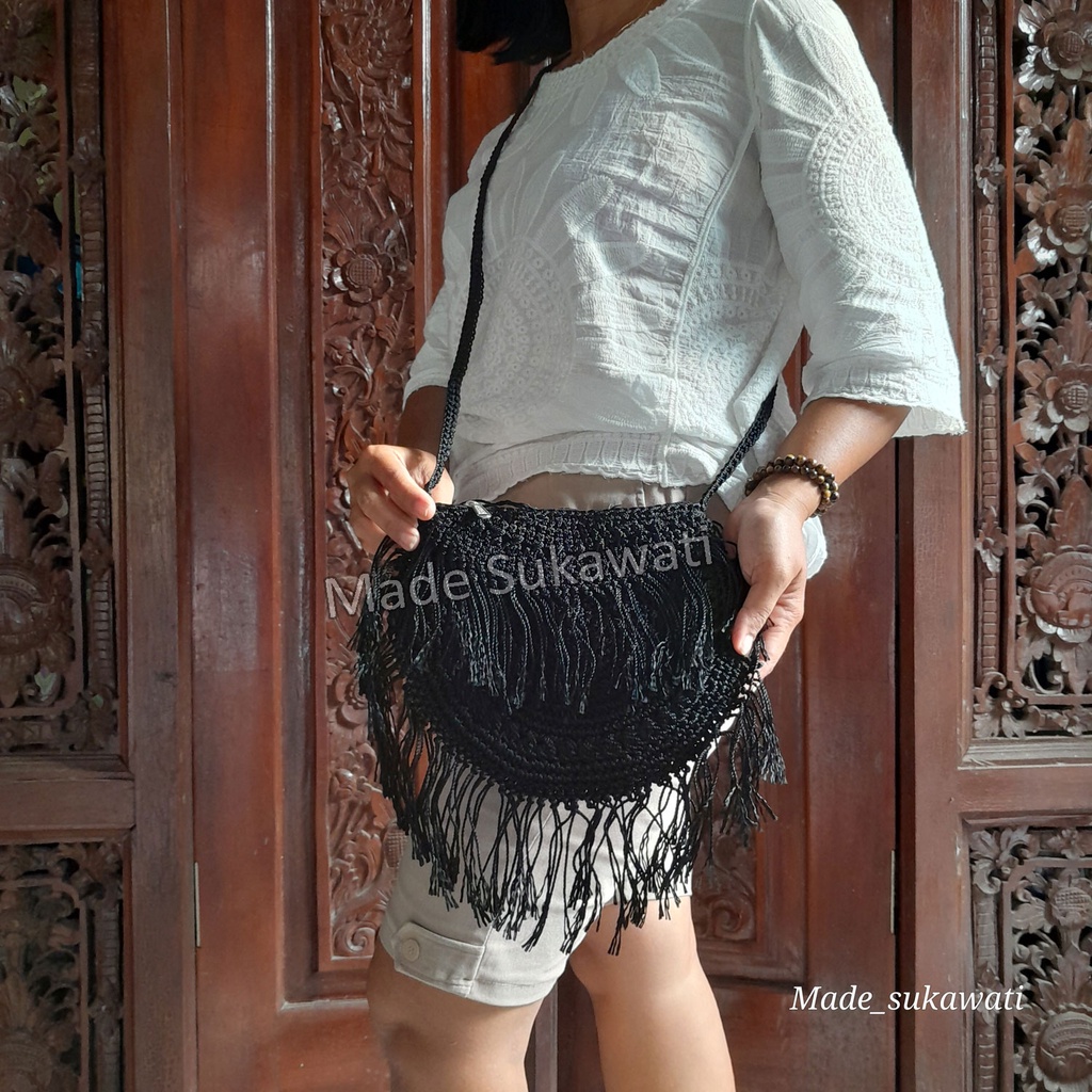 Tas slempang rajut variasi Rumbai, dengan tutup dan resleting dibagian dalam,