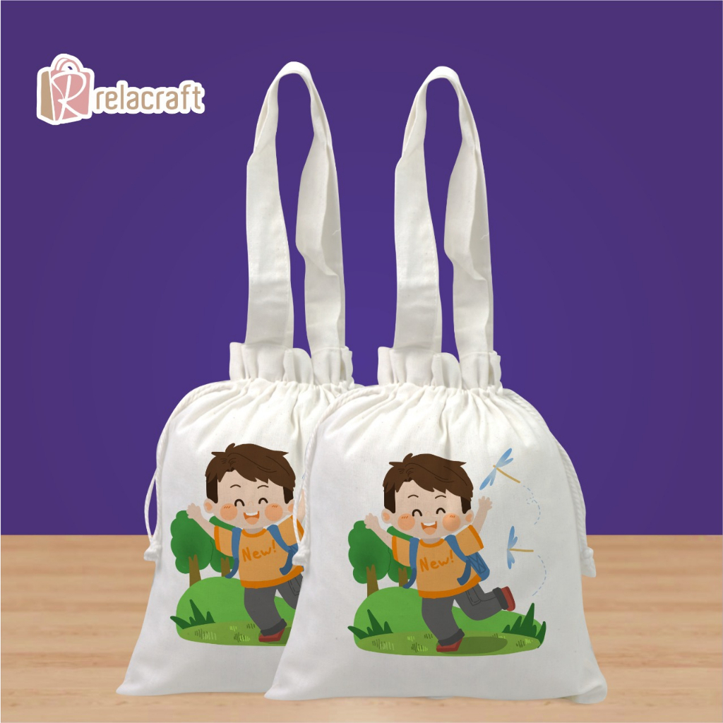 DETAIL: MODEL :TOTEBAG SERUT POCONG BAHAN :BLACU (HANYA 1 WARNA : PUTIH TULANG) UKURAN :P25XT30 -TOLERANSI UKURAN +/-1 CM- CETAK :FULLCOLOR UKURAN KERTAS F4 , CETAK 1 SISI TALI PEGANGAN :DARI BAHAN BLACU 50 CM PENUTUP : SERUT TALI