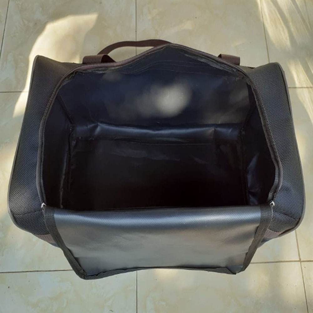 Size produk volume diatas 50 liter dengan ketahanan beban diatas 25 kilogram Dimensi produk 57cm x 25cm x 30cm Terdiri dari 1 kompartemen utama extra luas dengan volume lebih dari 50 liter Dengan tambahan kelengkapan kompartemen depan dan beberapa kompartemen saku Material bahan dibuat dari polyester serat nylon dengan ketahanan beban diatas 25 kilogram Pada bagian dalam produk lapisan bahan furing Produk multifungsi untuk ditenteng maupun diselempang Pada tali tenteng dilengkapi handle tenteng Pada kompartemen utama ada tambahan kantong dalam Pada bagian bawah terdapat kaki-kaki travel bag