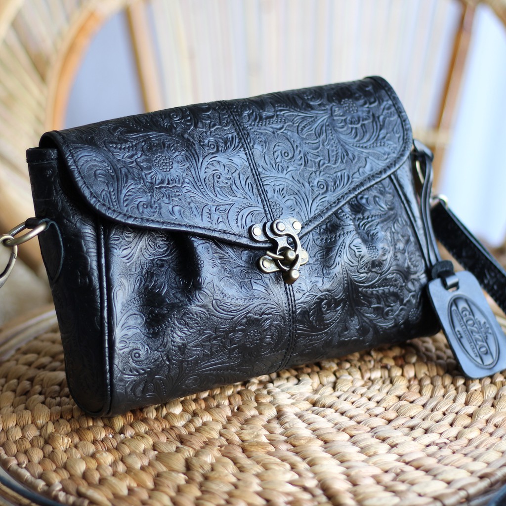 Detail TAS SLEMPANG WANITA KULIT ASLI MODEL CILLA BATIK HITAM / FREE GRAVIR NAMA