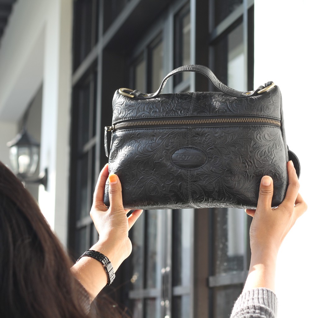 Detail TAS SLEMPANG WANITA KULIT SAPI RAISA EMBOS BATIK HITAM- FREE GRAVIR NAMA
