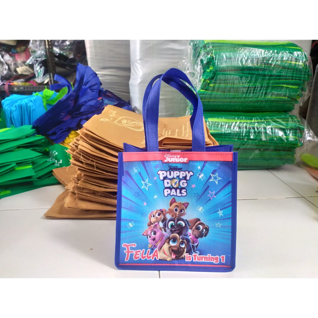 Tas Ultah Anak Costum Bahan kain spunbond tebal Kombinasi MMT Printing Ukuran P:20cm T:20cm L:12cm Harga @ Rp 2800