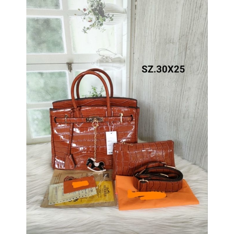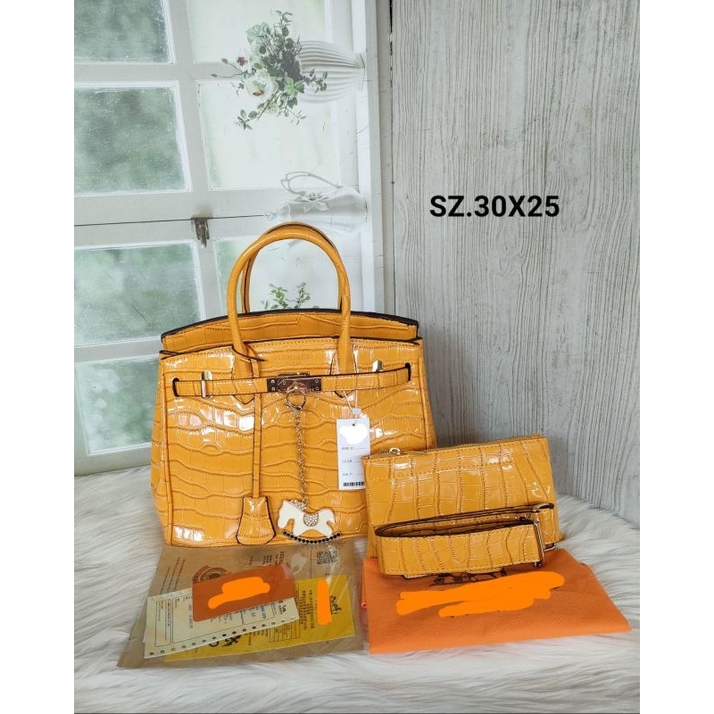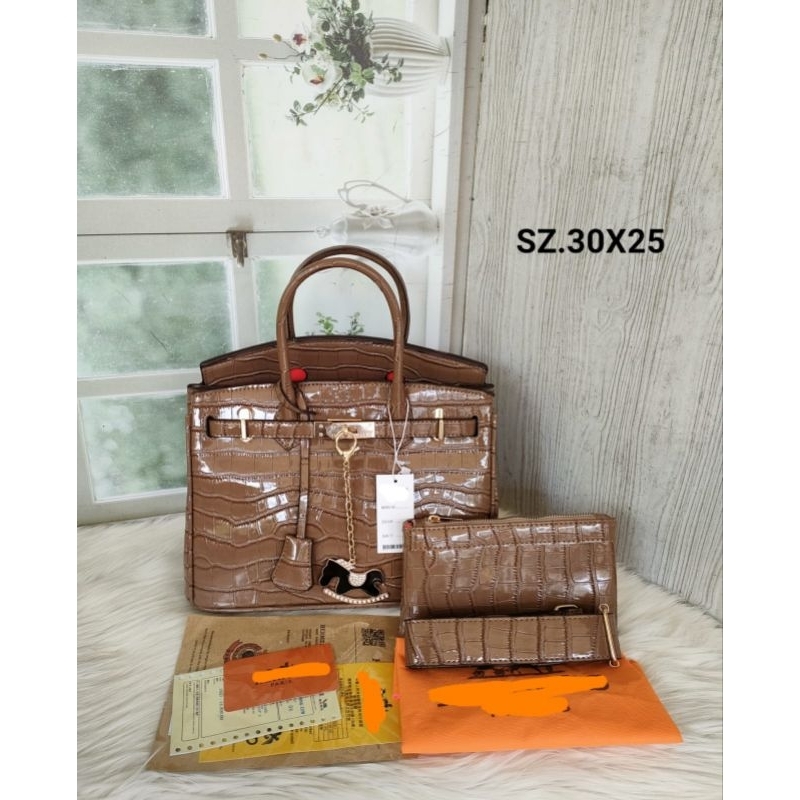 Tas BIR-KIN croco Material kulit croco glossy Sz 30x25 1 ruang udah embos 1 tali panjang kulit bisa di adjust Ada noser Free pouch Dustbag Ada fakebil Accesoris embos Bawah pake kaki- kaki Besi Ada gembok dan kunci ada accecoris kuda Berat 850 gram Rp. 185.000