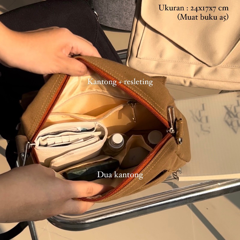 Detail totebag : Bahan kanvas PE (anti cipratan air) Terdapat 3 warna (midnight, cookies, dan beigesh) Ukurannya up to buku/binder ukuran A5 ukuran : 17x24x7 cm 3in1 bag (handbag, slingbag, shoulder bag) Terdapat resleting Terdapat furing