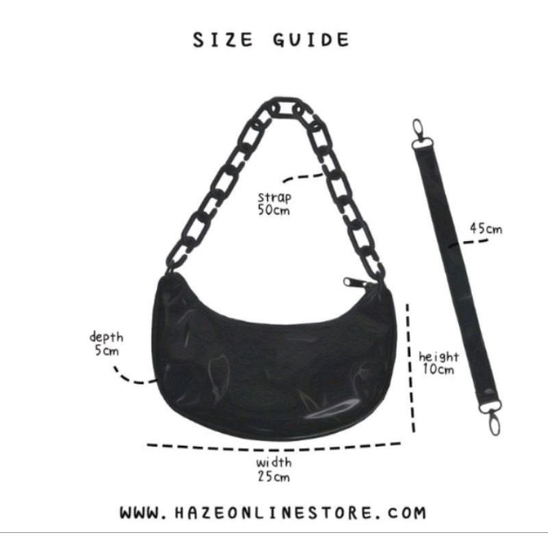 Include : 2 strap transparent strap (Pendek non-adjustable) chain strap (Strap bisa dilepas pasang dan diganti sesuai selera) Dimensi: 25cmx10cmx5cm Material : PVC 0,4mm Warna : Clear and Black #tastransparan #hazesac #transparanbag #transparentbag #taslucu #tasunik