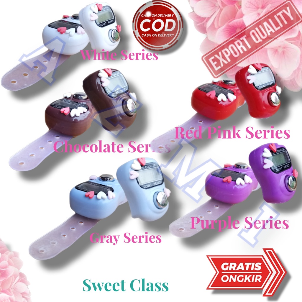 Tasbih digital sweety class Memudahkan anda untuk menghitung zikir Sangat pas di jari tangan anda Dengan warna warna cantik Desain mungil incaran banyak santri Bisa untuk souvenir atau hadiah untuk anak anda agar lebih semangat berzikir Lcd screen dispay Tombol untuk hitungan dan reset untuk mengembalikan ke angka O