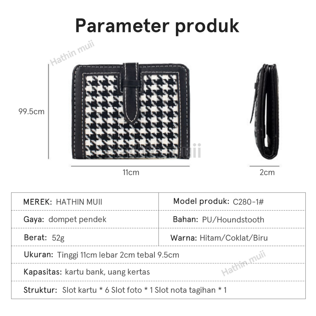 MEREK:HATHIN MUII Model produk: C280-1# Gaya: dompet pendek Bahan: PU/Houndstooth Berat: 52g ukuran:Tinggi 11cm lebar 2cm tebal 9.5cm Warna: Hitam/Coklat/Biru Kapasitas: kartu bank, uang kertas ukuran:11*9.5*1.5cm Struktur: Slot kartu * 6 Slot foto * 1 Slot nota tagihan * 1