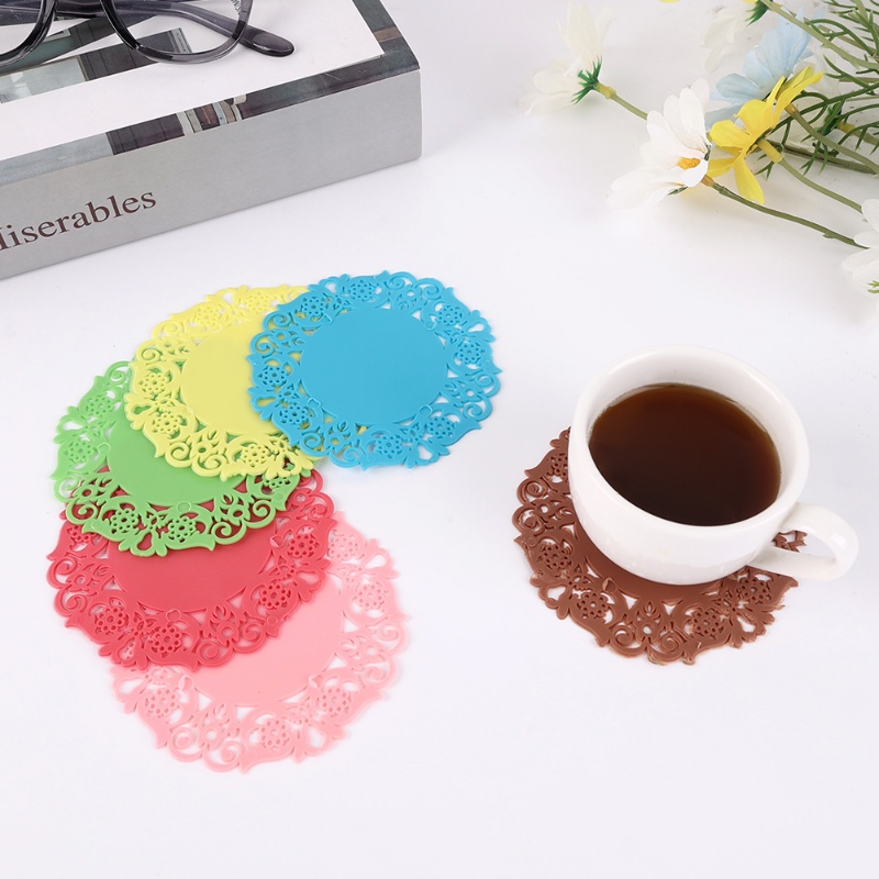 Detail Tatakan Cangkir Kopi / Teh Bahan Silikon Anti slip Desain Bunga Hollow Untuk Dapur