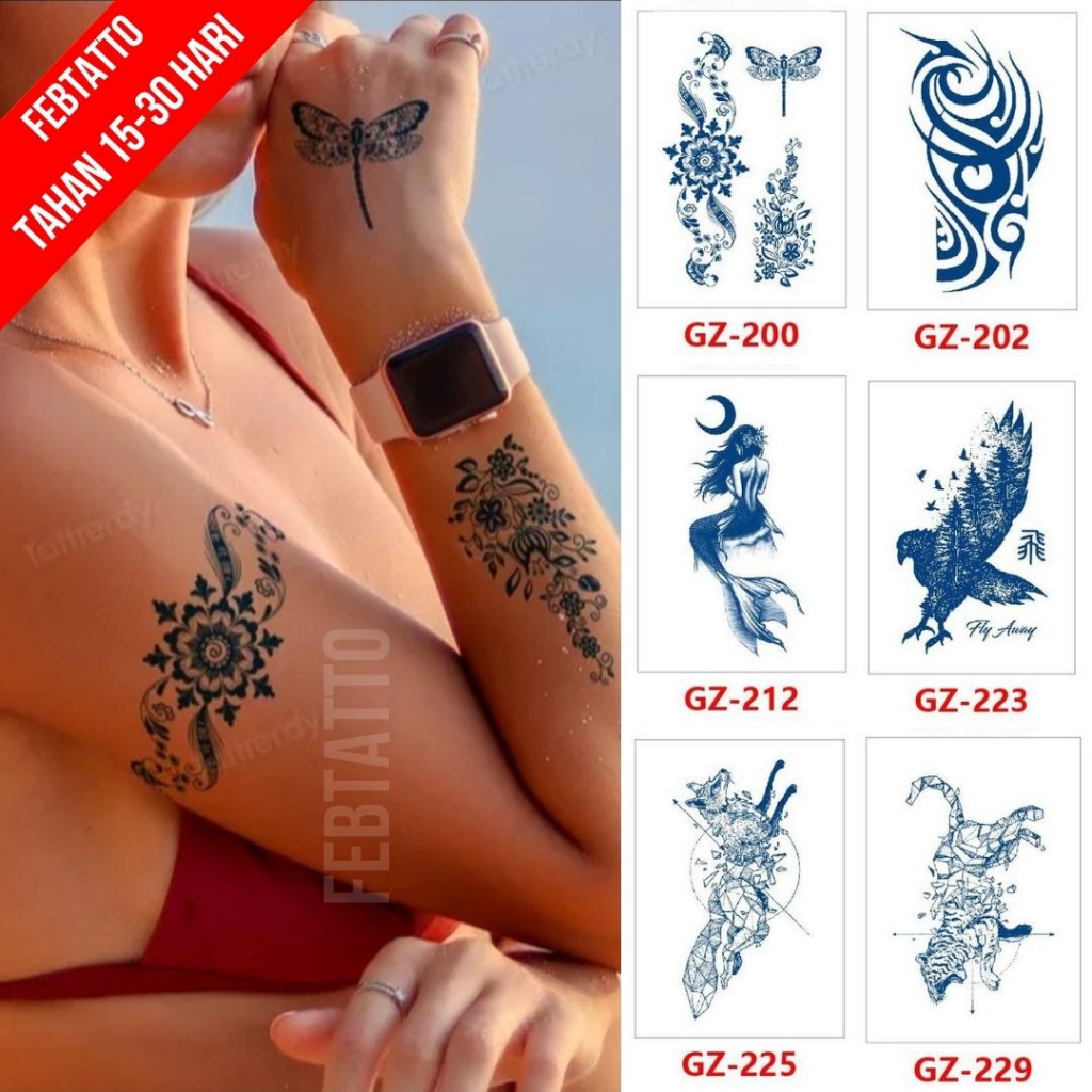 Video perkenalan produk Tato Semi Pemanent Tahan 1 Bulan Ukuran 11cmx18cmTato Lengan Tato Dada Tato tangan Tato Kaki Tato Punggung Tato Jari Motif Aesthetic Tatto Temporary Stiker Tato Halal Grosir Tato air motif bunga, tribal, putri duyung, burung, serigala, harimau GZ 200. Sumber: Shopee.