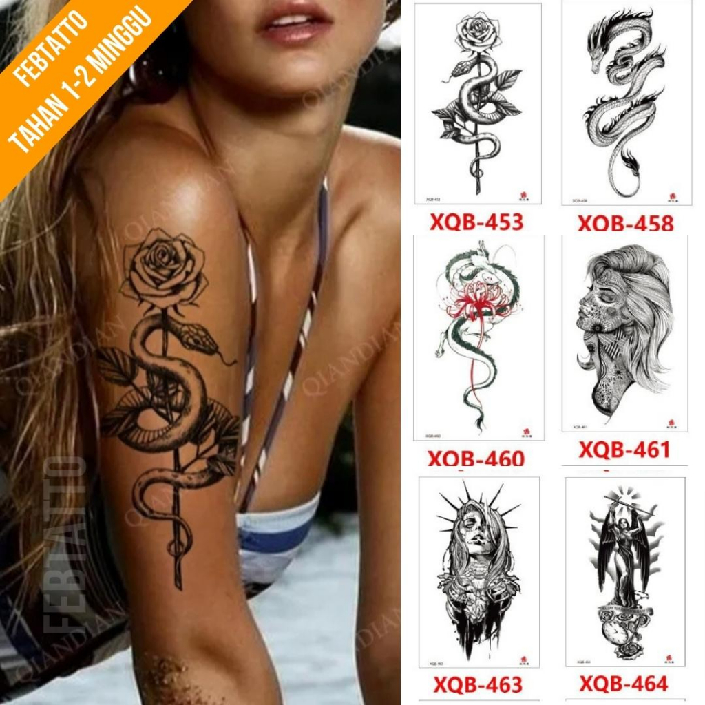 Aksesoris Fashion > Aksesoris Tambahan > Tato Temporer > Tato Temporer Ukuran 21cmx11cm Tato Lengan Tato Dada Tato tangan Tato Kaki Tato Punggung Tato Jari Motif Aesthetic Tatto Temporary Stiker Tato Halal Grosir Tato air motif bunga, ular, naga, perempuan XQB 453
