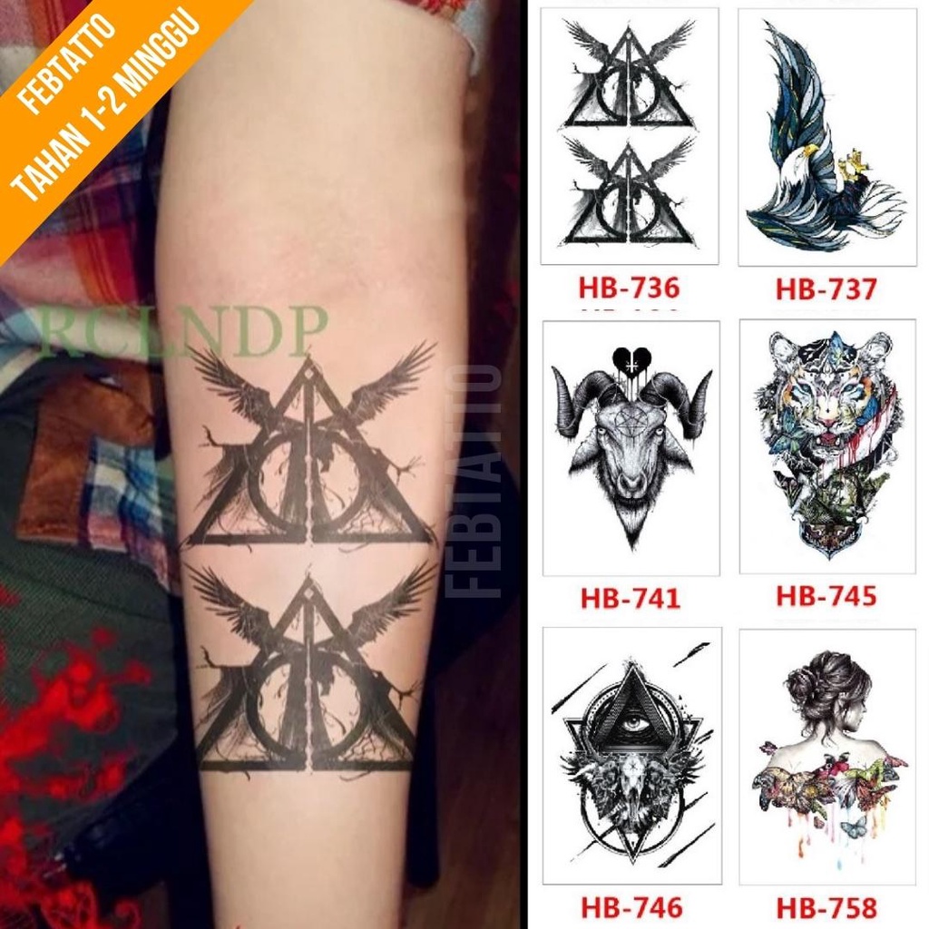 Detail Tato Temporer Ukuran 21cmx15cm Motif Aesthetic Tatto Temporary Stiker Tato Halal Grosir Tato air motif perempuan kupu kupu, segitiga sayap, burung garuda, kepala kambing, macan, iluminati HB 736