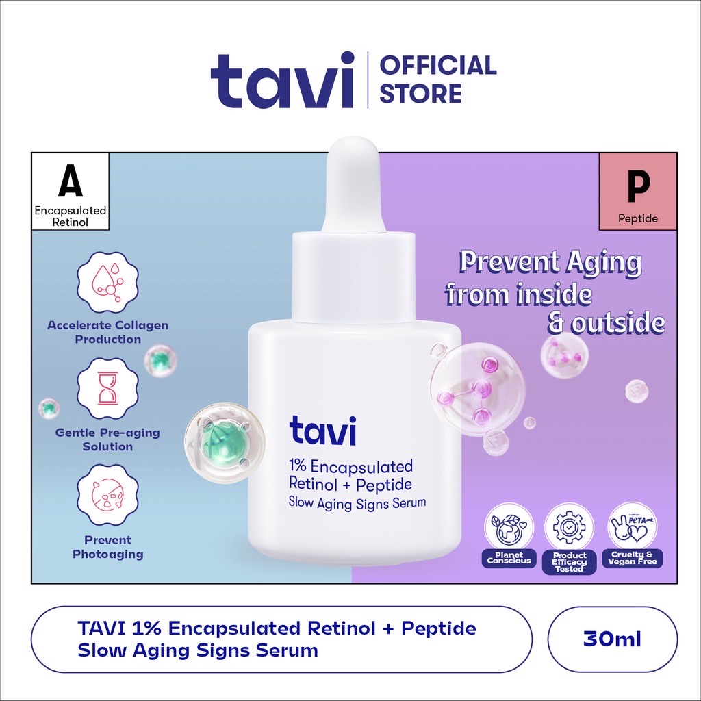 Detail TAVI 1% Encapsulated Retinol + Peptide Slow Aging Signs Serum Indonesia / Serum Wajah 30ml / Mencegah Tanda Penuaan Dini Anti Tua / Kerutan Garis Halus Noda Hitam Flek / Skincare Face Care Treatment Perawatan Kulit / Brightening Acne Moisture Peeling