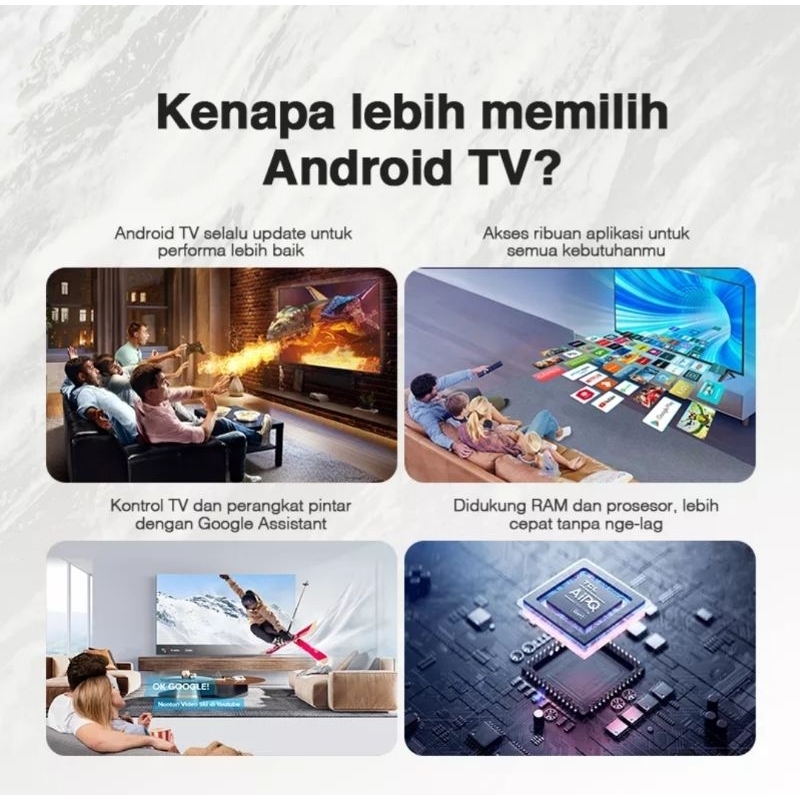 Perfect Smart function with google assistant Version Android 11.0 Certified google android tv Certified netflix Certified youtube Perfect Picture quality with HDR technology Perfect design with super narrow bezel Perfect sound quality with dolby audio & smart voice 3 years panel warranty + 1 year sparepart Ports Input HDMI,USB,Ethernet (LAN),Audio Out (Mini Jack),Composite in (AV) Resolusi HD (720p) TV Features Netflix,Youtube,HDR ,Wireless Connectivity,Web Browser,Mobile Screen Mirroring,Voice Control