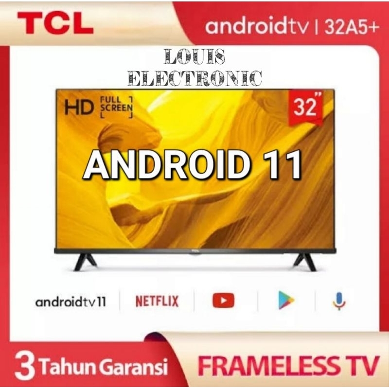 Details : - Frameless 97% almost full screen. - Perfect smart function with google assistant. - Certified google android 11.0. - Certified Netflix. - Certified You Tube. - Perfect picture quality with HDR Technology. - Perfect design with super narrow bezel. - HDMI Yes. - USB Movie N Picture Yes. - Perfect Sound Quality. - Dolby Audio DD+ By TCL Technology. - Surround Sound. - Smart Voice - TCL 32A5+ - 32 Inch HD HDR - Bezzel tipis - Mendukung perintah suara (Google assistant) - Netflix, Youtube, Google Play, Iflix, Line TV Stabil sudah di setifikasi - Prosesor Quad Core - Konektifitas : WiFi, Bluetooth, HDMI, USB, AV Port - OS Android 11.0 - Sudah smart AI - Built in chromecast untuk mirorring - Audio Dolby - Dimensi : Bisa cek gambar produk - Port : Bisa cek gambar produk- Certified Netflix. - Certified You Tube. - Perfect picture quality with HDR Technology. - Perfect design with super narrow bezel. - HDMI Yes. - USB Movie N Picture Yes. - Perfect Sound Quality. - Dolby Audio DD+ By TCL Technology. - Surround Sound. - Smart Voice - TCL 32A5+ - 32 Inch HD HDR - Bezzel tipis - Mendukung perintah suara (Google assistant) - Netflix, Youtube, Google Play, Iflix, Line TV Stabil sudah di setifikasi - Prosesor Quad Core - Konektifitas : WiFi, Bluetooth, HDMI, USB, AV Port - OS Android 11.0 - Sudah smart AI - Built in chromecast untuk mirorring - Audio Dolby - Dimensi : Bisa cek gambar produk - Port : Bisa cek gambar produk Barang Original dan Bergaransi Resmi