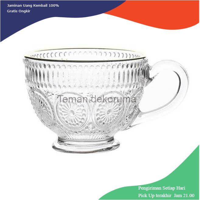 Gelas ini cocok digunakan untuk menyeduh kopi, teh dan minuman panas maupun dingin. Memiliki kapasitas 325ml yang sangat cocok untuk menjadi wadah minuman kesukaan Anda. Hadir dengan desain elegan bergaya retro yang unik yang cocok digunakan untuk jamuan pada kolega Anda. Terbuat dari bahan berkualitas yang awet untuk penggunaan jangka panjang. Fitur Desain Bunga Matahari Klasik Hadir dengan desain bunga matahari bergaya klasik yang sangat cocok untuk Anda gunakan untuk menjamu tamu Anda. Desain ini sangat cocok untuk beragam jenis perayaan sehingga memiliki cangkir ini merupakan keuntungan bagi Anda. Cocok untuk Berbagai Jenis Minuman Cangkir ini hadir dengan kapasitas 325 ml yang biasanya kapasitas tersebut merupakan kapasitas yang ideal untuk menyajikan sebuah minuman seperti kopi maupun teh. Bahan Berkualitas Terbuat dari bahan kaca berkualitas yang tidak akan merubah rasa dan aman digunakan untuk minum. Bahan ini juga terkenal awet dan cocok untuk penggunaan jangka panjang.