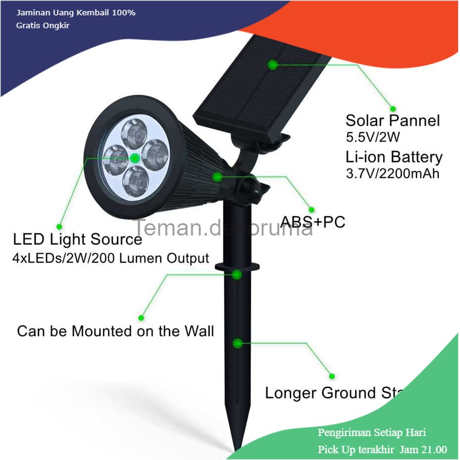 Lampu hias yang sangat cocok untuk penerangan di luar ruangan seperti taman. Lampu taman hias ini memiliki pencahayaan LED yang terang berkat penggunaan 4 buah LED sehingga mampu menerangi pekarangan, kebun, taman Anda di malam hari. Anda tidak perlu menggunakan sambungan listrik karena panel surya akan menghimpun daya matahari untuk menyalakan lampu. Fitur Lampu LED Terang Lampu taman hias ini menggunakan lampu penerangan jenis LED sehingga mampu menghasilkan cahaya yang sangat terang dan mampu memenuhi kebutuhan cahaya Anda pada malam hari di luar ruangan. Tenaga Matahari Tidak perlu memperhitungkan biaya listrik karena lampu telah dibekali dengan panel surya. Lampu akan menyala menggunakan daya matahari yang telah dihimpunsehingga Anda tidak memerlukan energi listrik rumah. Daya Hidup Panjang Panel surya dibekali baterai berkapasitas 2000 mAh. Kapasitas yang cukup besar hingga mampu menyalakan lampu sepanjang malam. Pada bagian belakang panel juga terdapat tombol pengaturan yang dapat Anda akses dengan mudah. Lampu Anti Air Sebagai lampu luar ruangan, lampu tancap ini telah dibekali material yang tahan air dengan kelasIP55. Lampu dan panel surya akan tetap beroperasi dengan baik meski hujan menerjang.